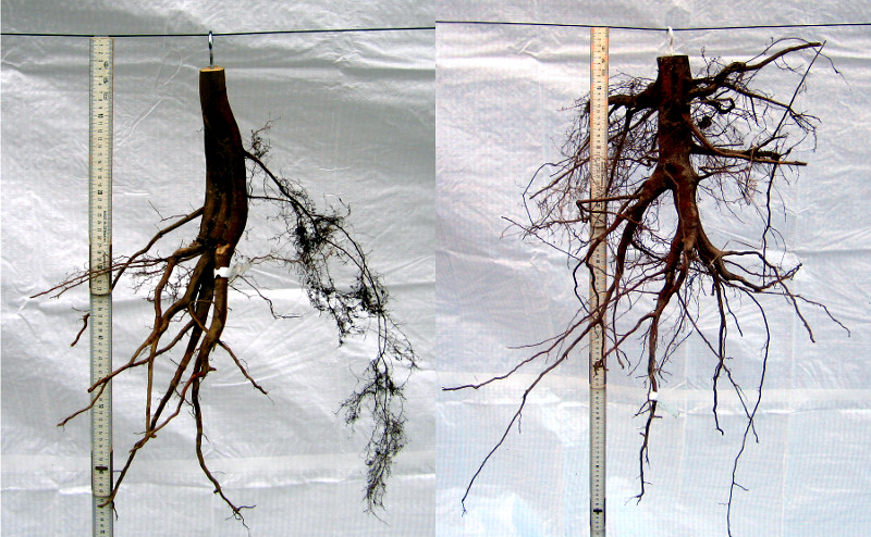 Abb. 5: Wurzel einer Baumschulpflanze (links) und eines Wildlings (rechts) (Foto: J. Stiegler)