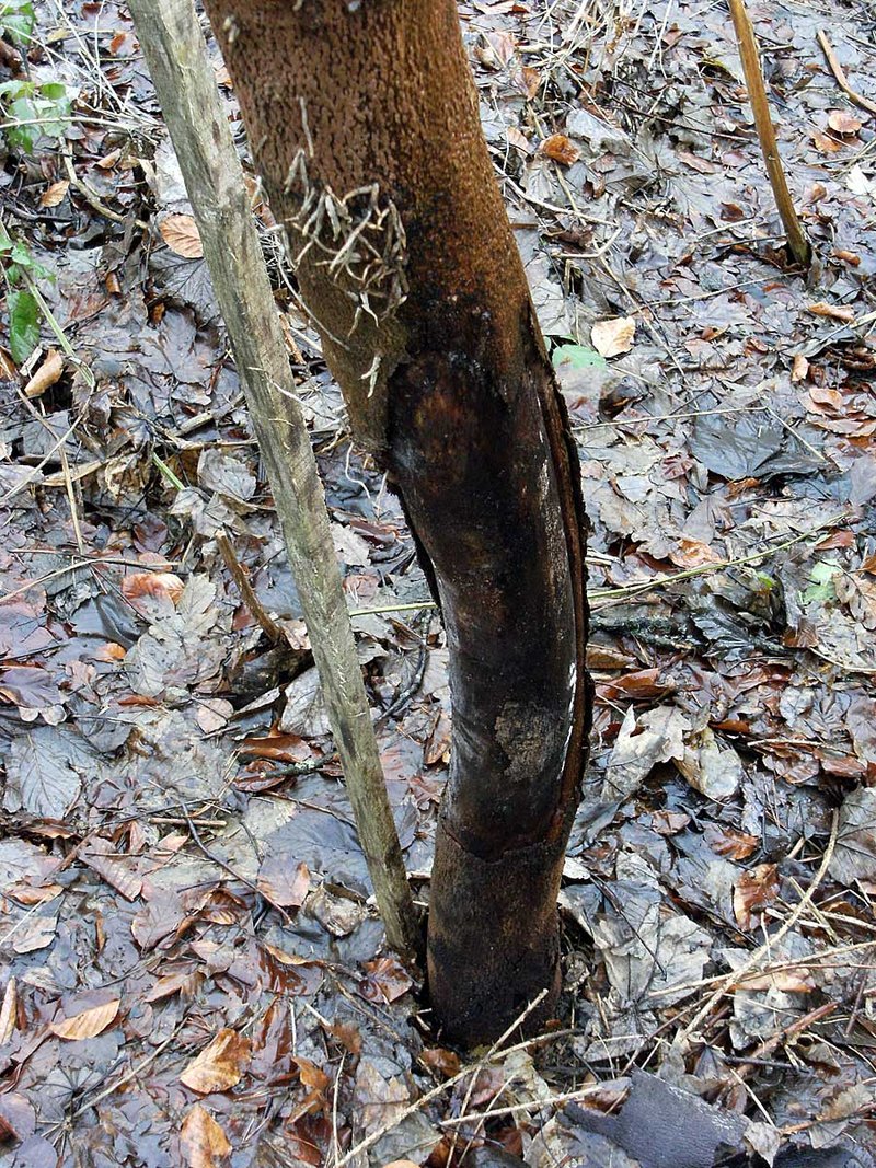Abb. 3: Kambiumschäden und Wurzelbildung an Bergahorn durch ungenügendes Aufplatzen der Wuchshülle.