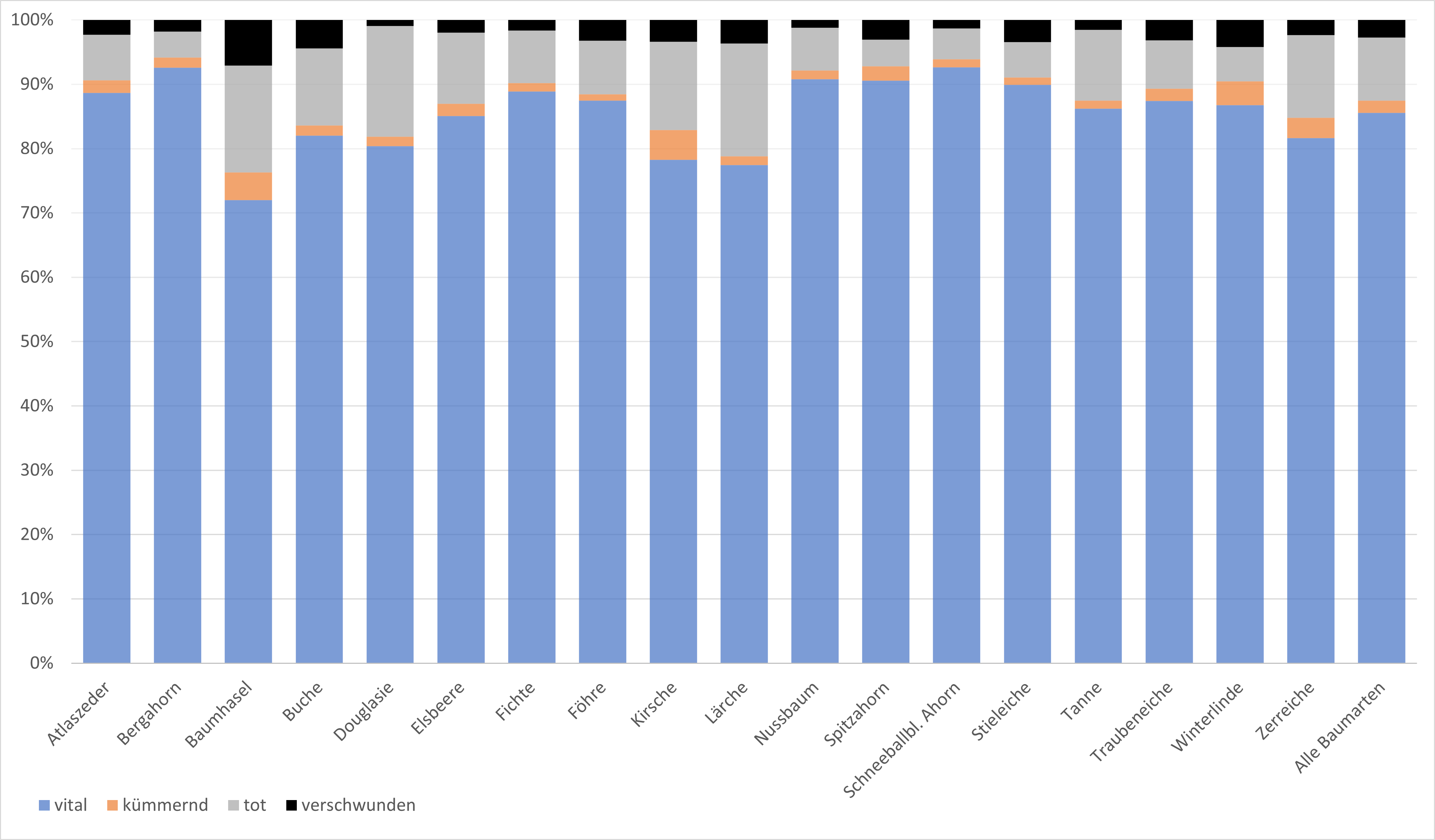 Erste Ergebnisse von 2023 weisen darauf auf ein insgesamt zufriedenstellendes Anwachsen hin. Insgesamt waren 86% aller Pflanzen vital. Die Mortalität betrug 12% (Abb. 4). Die höchsten Überlebensraten zeigte der Bergahorn mit 95 %, die niedrigsten waren bei Baumhasel mit 76% zu verzeichnen.