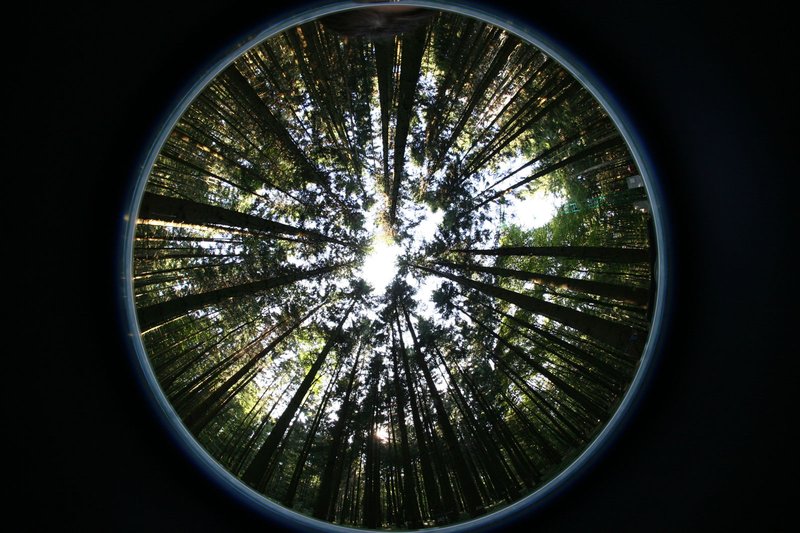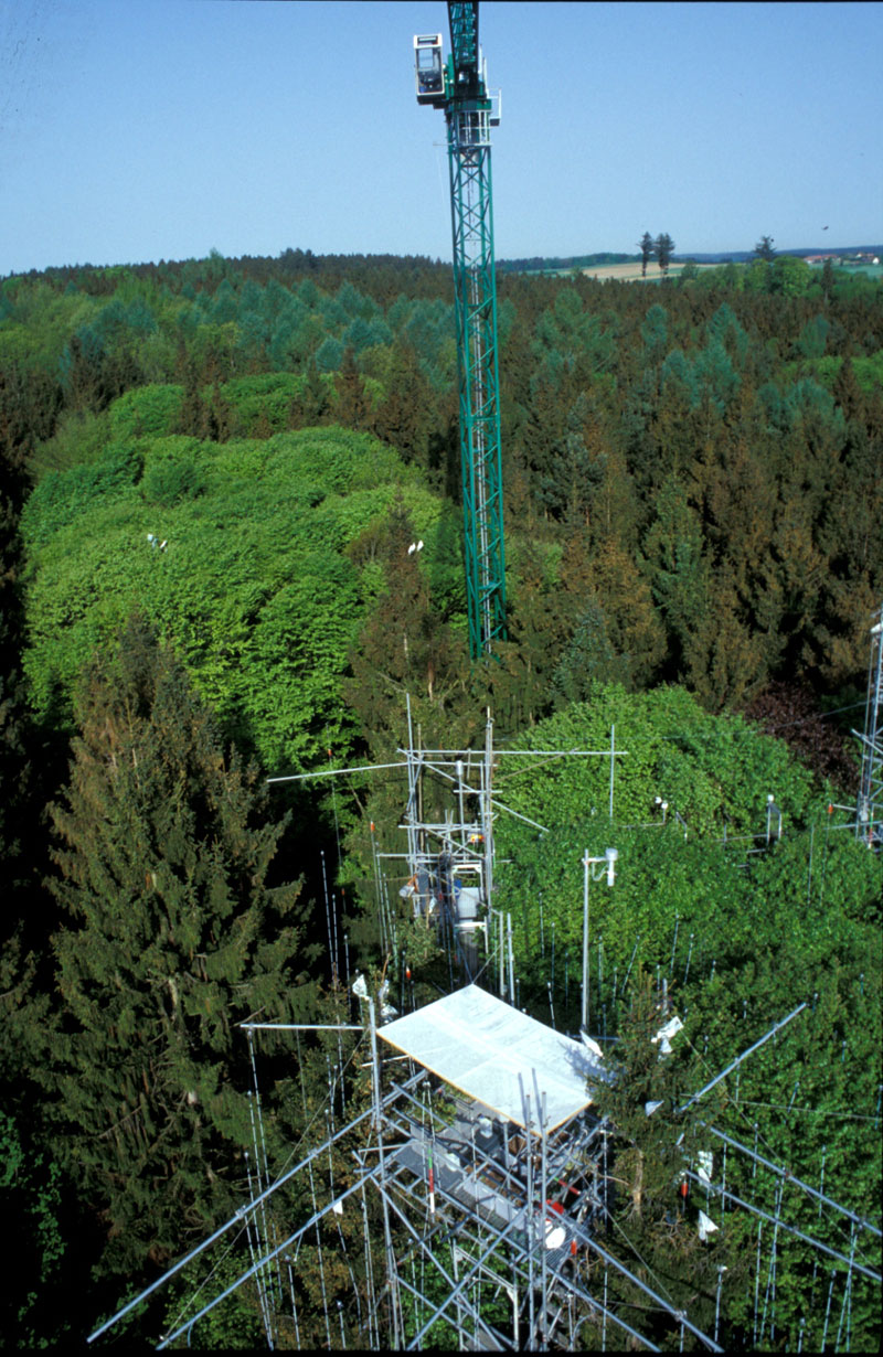 Mit einem Drehkran (Abb. 1), der auf der Versuchsfläche im Kranzberger Forst bis über die Baumkronen reicht, konnte sich Janott frei in den Kronen bewegen und direkt über einzelnen Ästen der an die Lücken angrenzenden Buchen und Fichten hemisphärische Fotos schießen. Im Anschluss errechnete Janott mit Hilfe des Analyseprogramms den Stand der Sonne an jedem Zeitpunkt des Jahres, kombinierte diese Daten mit Informationen aus den hemisphärischen Fotos und der Vegetationsperiode und erhielt schließlich den potenziellen Lichtgenuss einer ausgewählten Position, beispielsweise eines bestimmten Astes, der in die nach der Fällung entstandene Lücke reichte.