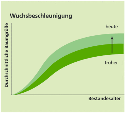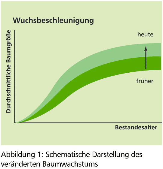 Waldbestände folgen nach wie vor ähnlichen Regeln der Baum- und Bestandesallometrie. So verändert sich z.B. bei gegebener Bestandeshöhe das erreichte Volumen nicht. Gleiche Baum- und Bestandesgrößen werden schlichtweg in früherem Alter erreicht als in der Vergangenheit. Weil sich Bäume und Waldbestände schneller entwickeln, ist die Baumzahl bei gegebenem Alter gegenwärtig um 17 bis 20 Prozent geringer als in der Vergangenheit. Statistische Analysen zeigen, dass die Wachstumsbeschleunigung in erster Linie auf Temperaturerhöhungen und Verlängerungen der Vegetationszeit zurückzuführen sind. Sie fallen auf gut mit Nährstoffen versorgten Standorten besonders deutlich aus.
