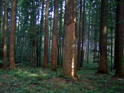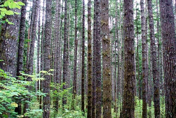 Abb. 1: Versuchsfläche in 102-jährigem Dgl-Mischbestand, entstanden aus 400 in Bu-Naturverjüngung gepflanzten Dgl je ha (Höhe 47 m, 152 Dgl/ha, Mittendurchmesser 79 cm, Grundfläche 74 m²/ha, Vorrat 1.323 Vfm/ha).