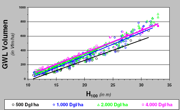 Bei insgesamt sehr straffen Beziehungen zwischen Oberhöhe und volumenbezogener Gesamtwuchsleistung (GWL) zeigt sich bei den vier Varianten eine von der Ausgangsbaumzahl abhängige GWL mit höheren Werten für die stammzahlreicheren Varianten (Abb. 2). Allerdings haben sich die Unterschiede zwischen den 4.000er und 2.000er Varianten bis zu einer Höhe von ca. 30 m wieder egalisiert und auch der Unterschied zur 1.000er Variante nimmt mit steigender Bestandeshöhe tendenziell eher ab. Derzeit weist nur noch die 500er Variante eine markant geringere GWL auf.