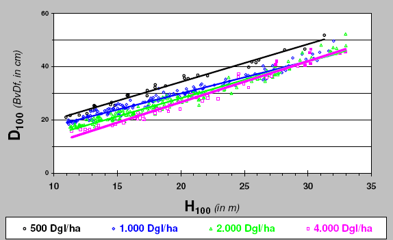 Die Durchmesserentwicklung der 100 stärksten Bäume je ha (D100) verläuft spiegelbildlich zur GWL. Mit fortschreitender Höhenentwicklung nehmen die Unterschiede, die sich zu Beginn der Messreihe in Abhängigkeit von der Ausgangsbaumzahl zeigen, wieder ab. Bei einer Höhe von ca. 30 m haben sich die D100 der 4.000er, 2.000er bzw. 1.000er Varianten weitestgehend wieder angenähert, während der D100 der 500er Variante deutlich darüber liegt (Abb. 3).