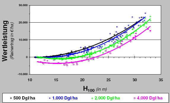 Abb. 4: Entwicklung der Wertleistung (Reinertrag aus Holzernte; ohne Aufwand für Kulturen) in Abhängigkeit der Bestandeshöhe.