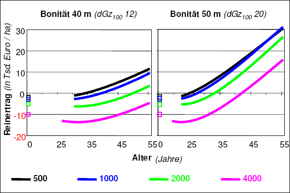 Abb. 5 zeigt exemplarisch für eine schwache (dGz100 12) und eine gute Dgl-Bonität (dGz100 20) die gesamte Wertentwicklung (inkl. Pflanzungskosten) der vier Varianten über dem Alter. Die bei den holzerntekostenfreien Erlösen zu beobachtenden Unterschiede werden bei zusätzlicher Berücksichtigung der Pflanzungskosten noch verstärkt. Das Niveau der Wertleistung steigt mit abnehmender Baumzahl von der 4.000er zur 1.000er Variante deutlich an. Der Niveauunterschied ist dabei zwischen der 1000er Variante und der 500er Variante am geringsten. Hinsichtlich der absoluten Höhe der Reinerträge bestehen zwischen den beiden Bonitäten zwar naturgemäß erhebliche Unterschiede. Die Unterschiede zwischen den vier Varianten bewegen sich jedoch trotz erheblicher Bonitätsunterschiede bei beiden Bonitäten auf vergleichbarem Niveau.