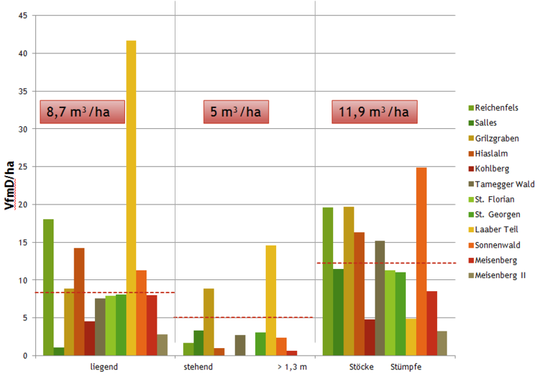 Trotz des Bekenntnisses zu einem naturnahen Waldbau zeigen die Erhebungen geringere Totholzvorräte, als die österreichische Waldinventur ÖWI durchschnittlich für dieselben Waldgesellschaftsgruppen ausweist. Auch die Gegenüberstellung mit den Totholzvorräten in Naturwaldreservaten zeigt wesentlich geringere Vorräte, insbesondere an stehendem Totholz. Ebenso ergibt die Habitatbaumdichte je nach Eignung für Wirbellose und Pilze, Wirbeltiere und Sonderformen ein uneinheitliches Bild. Es zeichnet sich also die Notwendigkeit eines zusätzlichen Totholz- und Habitatbaum-Konzeptes ab, um diese wichtigen Strukturelemente im Sinne einer umfassenden naturnahen Waldbewirtschaftung zu fördern und zu erhalten.