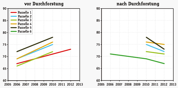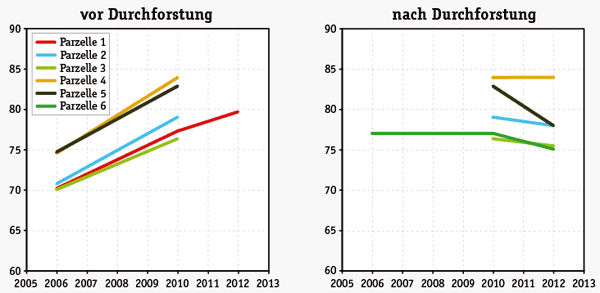 Der Gesamtbestand zeigt eine ähnliche Entwicklung: Der Anstieg der HD-Werte erfolgt im Gegensatz zu den Z-Bäumen auf höherem Niveau und rascher. Auch hier bewirkte die Durchforstung 2010 eine Trendumkehr, der HD-Wert des Bestandes bleibt bis 2012 auf gleicher Höhe oder sinkt sogar ab. Auf Parzelle 6 blieb der HD-Wert von 77 von 2006 bis 2010 gleich hoch und sinkt anschließend leicht ab. Bei der Betrachtung dieses Ergebnisses ist zu berücksichtigen, dass bei der Durchforstung 2007 nicht alle unterdrückten und beherrschten Bäume entnommen worden sind. Diese Bäume haben durchwegs hohe, steigende HD-Werte, die beim Bestandesmittel das Absinken der HD-Werte der herrschenden Bäume überdecken (Abbildung 2).