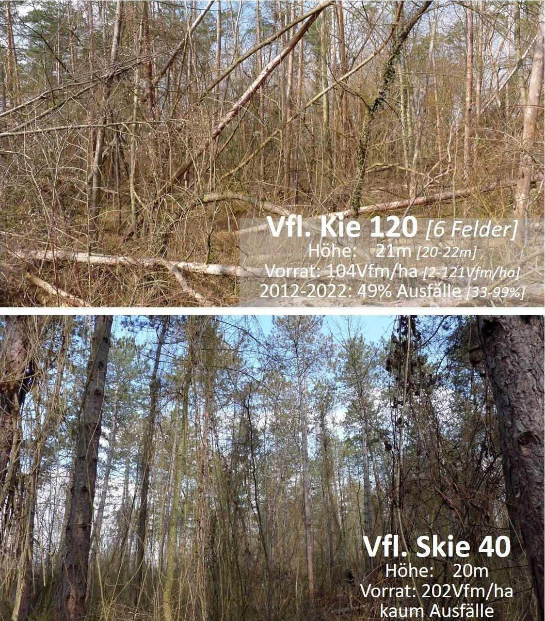 Vor dem Hintergrund dieser doch recht substantiellen Datenbasis lag es nahe, das Versuchsflächennetz daraufhin abzuklopfen, ob sich die Erwartungen an die Schwarzkiefer empirisch bestätigen lassen und wie der Vergleich zur Waldkiefer ausfällt.