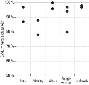 Erste Ergebnisse von den erst relativ kurz beobachteten "Solitärversuchen" zeigen auf fünf verschiedenen Versuchsorten, dass Bestände, die bereits im Dickungsstadium auf 700 Bäume je ha reduziert wurden, trotzdem 78 bis zu 100% (!) der Gesamtwuchsleistung von "normal" auslesedurchforsteten Parzellen leisten können (Abbildung 3). Dieser etwas überraschende Umstand findet zumindest teilweise eine Erklärung in den längeren und breiteren Baumkronen mit größeren Nadelmassen der bereits sehr früh stammzahlreduzierten Bestände.