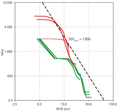 Die Kurvenverläufe zeigen, dass die Bestockung nicht über eine bestimmte Grenze steigen kann. Die Gerade in Abbildung 1 ist die bei einem bestimmten Durchmesser maximal mögliche Stammzahl. Wird wachstumsbedingt diese Linie erreicht, so muss mit weiterer Durchmesserzunahme die Stammzahl abnehmen, das heißt, es tritt Mortalität ein (rote Linien der unbehandelten Variante). Bestände mit niedriger Stammzahl der Durchforstungsvariante (grüne Linien) können solange ungestört wachsen, solange sie die Linie der maximal möglichen Bestockung noch nicht erreichen.