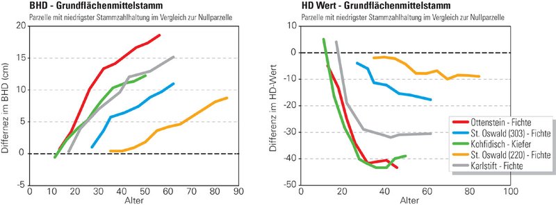 In Abbildung 2 und 3 sind Ergebnisse von fünf Durchforstungsversuchen (Fichte bzw. Weißkiefer in Kohfidisch) dargestellt. Sie zeigt einerseits die Differenz im Durchmesser zwischen der Variante mit niedriger Stammzahlhaltung und der unbehandelten Vergleichsvariante und andererseits die Unterschiede im H/D-Wert.