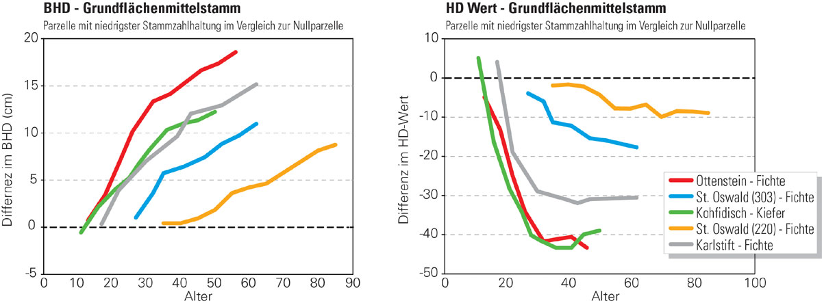 In den derzeit 40- bis 60-jährigen Versuchsbeständen sind die Auswirkungen der verschiedenen Behandlungsvarianten hinsichtlich Bestandesstabilität und Stammdimensionen bereits deutlich erkennbar. Der internationale IUFRO-Durchforstungsversuch bei Ottenstein im Waldviertel ist die größte und bekannteste dieser Versuchsanlagen. Die Ergebnisse der dort untersuchten Durchforstungsvarianten von hoher bis niedriger Stammzahlhaltung sind beispielhaft. Bei 5 m Oberhöhe wurde auf 2500 Bäumen je ha reduziert, danach erfolgten die Eingriffe in unterschiedlicher Stärke und Raschheit.