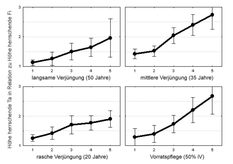 Deutlich erkennbar ist, dass während der Überschirmung die Tanne erwartungsgemäß im Vergleich zur Fichte größere Höhenzuwächse realisiert und dadurch in der relativen Höhe kontinuierlich zulegt (Abb 5). Während sich bei raschem Verjüngungsgang (Nutzung des Altbestandes innerhalb von 20 Jahren) in den Phasen mit stark aufgelockertem bzw. bereits abgedecktem Schirm (Aufnahmen 3–5) eine Stagnation der Höhenrelation zwischen Tanne und Fichte andeutet, baut die Tanne auf den anderen Flächen bei (noch) anhaltender Überschirmung ihren Höhenvorsprung weiter aus.