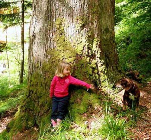 Das Naturdenkmal "Kostgrundtanne" in Oberprechtal-Hintertal: Tanne mit BHD 147 cm, Höhe 51 m, Volumen 31 VfmDmR. Im Bild: Tochter Ann-Katrin und Hund "Frau Dengerle". (Foto: U. Kohnle)