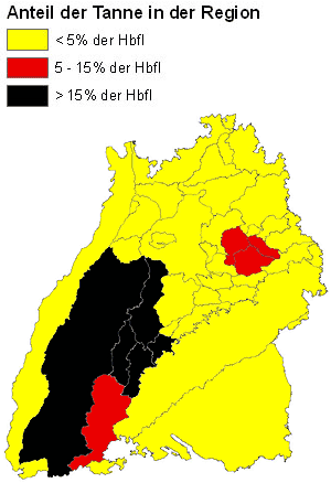 Trotz erheblicher – historisch bedingter – Flächenrückgänge blieb der Tanne in Südwestdeutschland bis heute eine Sonderstellung erhalten. Ausweislich der zweiten Bundeswaldinventur (BWI2) konzentriert sich der Hauptanteil (> 60 %) der deutschen Tannenvorkommen auf Baden-Württemberg. Der Abstand zum zweiten regionalen Schwerpunkt in Bayern (rd. 30 % der Tannenfläche in Deutschland) ist bereits erheblich; in den anderen Bundesländern kommen heute allenfalls marginale Tannenflächen vor.