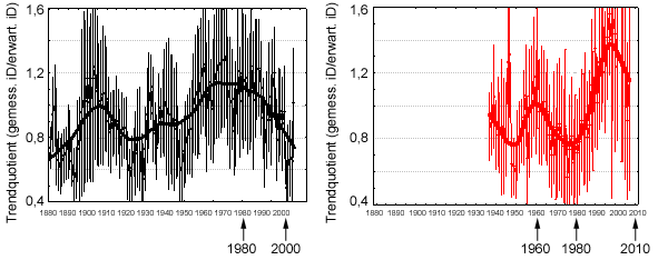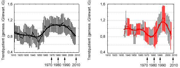 Abb. 3: Umweltbedingte Grundflächen-Zuwachstrends ganzer Bestände aus Fichte (links, schwarz) oder Tanne (rechts, rot) in Baden-Württemberg. Dargestellt sind Jahresmittelwerte, Standardabweichung und eine lowess-Glättungsfunktion (Steifheit 0,25); Quelle: periodische Wiederholungsaufnahmen langfristiger waldwachstumskundlicher Versuchsflächen.
