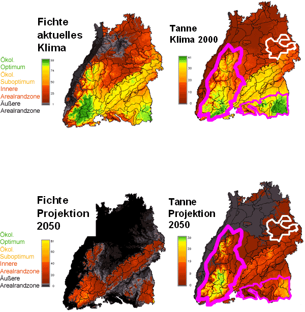 Insgesamt wird auch deutlich, dass sich die Verhältnisse für Tanne weniger einschneidend verändern dürften als für Fichte. In einigen Bereichen Baden-Württembergs könnte die Tanne tatsächlich mittelfristig, als klimatisch besser geeignete ertragsstarke Baumart, die Fichte zumindest teilweise ersetzen. Diese vorläufige Einschätzung gilt in Südwestdeutschland allerdings nur für Gebiete innerhalb des natürlichen Tannen-Verbreitungsgebietes.