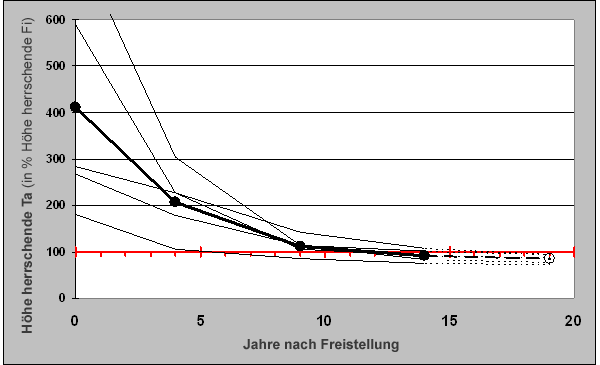 Um sich bis zur ersten Durchforstung im Herrschenden halten zu können, benötigen Tannen daher in unbehandelt wachsenden Mischverjüngungen im Regelfall bei Freistellung einen erheblichen Höhenvorsprung vor der Fichte. Dies zeigt sich bei einer anderen Untersuchung in unbehandelten, gemischten Naturverjüngungen 14 Jahre nach Freistellung durch Sturm (Frühjahr 1990): Die zum Zeitpunkt der Untersuchung (Winter 2003/04) noch im Herrschenden beteiligten Tannen hatten zum Zeitpunkt der Freistellung die Fichten um ein Mehrfaches an Höhe übertroffen (Abb. 6). Innerhalb von nur 14 Jahren hatten die Fichten diesen deutlichen Wuchsvorsprung im Wesentlichen bereits eingeholt. Die mit großem Höhenvorsprung gestarteten Tannen waren allerdings noch nicht entscheidend überwachsen sondern immer noch im Herrschenden beteiligt.