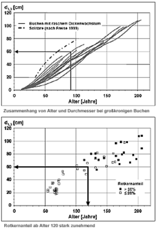 Die an den Buchen durchgeführten Jahrringanalysen ergaben, dass auch Bäume mit besonders raschem Dickenwachstum für einen Durchmesser von 60 cm etwa 90 Jahre, für 80 cm 120-130 Jahre benötigten (Abb. 1). Es zeigt sich, dass die 70 untersuchten Buchen zwar nicht frei von Rotkern waren, sich jedoch anhand des Untersuchungsmaterials eine Durchmesser-/Altersgrenze von etwa 60 cm und 120 Jahren bestimmen ließ, unterhalb derer eine Entwertung durch Rotkern kaum zu befürchten ist (Abb. 2).