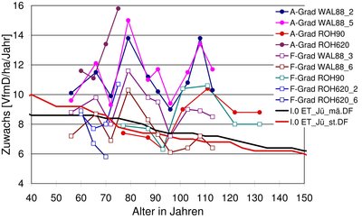 Abb. 3: Der laufende jährliche Volumenzuwachs auf A-Grad-Parzellen und sehr stark behandelten Parzellen (F-Graden) im Vergleich zur Ertragstafel Jüttner (1955), mäßige und starke Durchforstung; dargestellt sind die Versuchsflächen Waldleiningen 88 (WAL) im Pfälzer Wald und Rohrbrunn 90 und 620 (ROH) im Spessart.