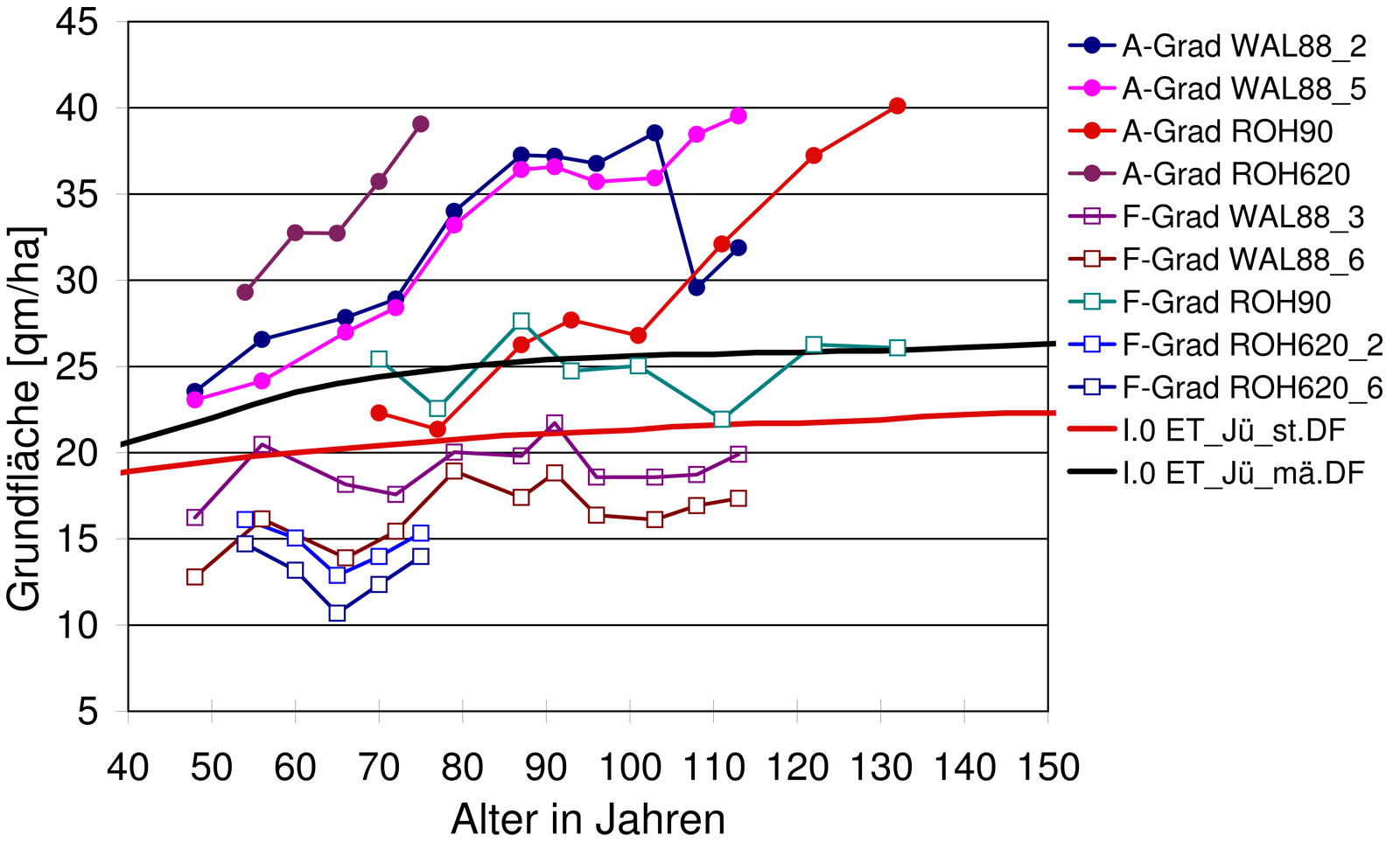 Bemerkenswert ist, dass die Grundflächenhaltung in den A-Graden in den letzten Jahrzehnten deutlich, vom Ertragstafelniveau ausgehend, und sehr steil angestiegen ist (Abb. 2). Nachdem die Höhenentwicklung nahezu ertragstafelgemäß verläuft, aber die Grundflächenwerte von den Ertragstafelvorstellungen mehr und mehr abweichen, ist zu folgern, dass sich das Ertragsniveau der Bestände in erheblichem Maße verbessert hat.