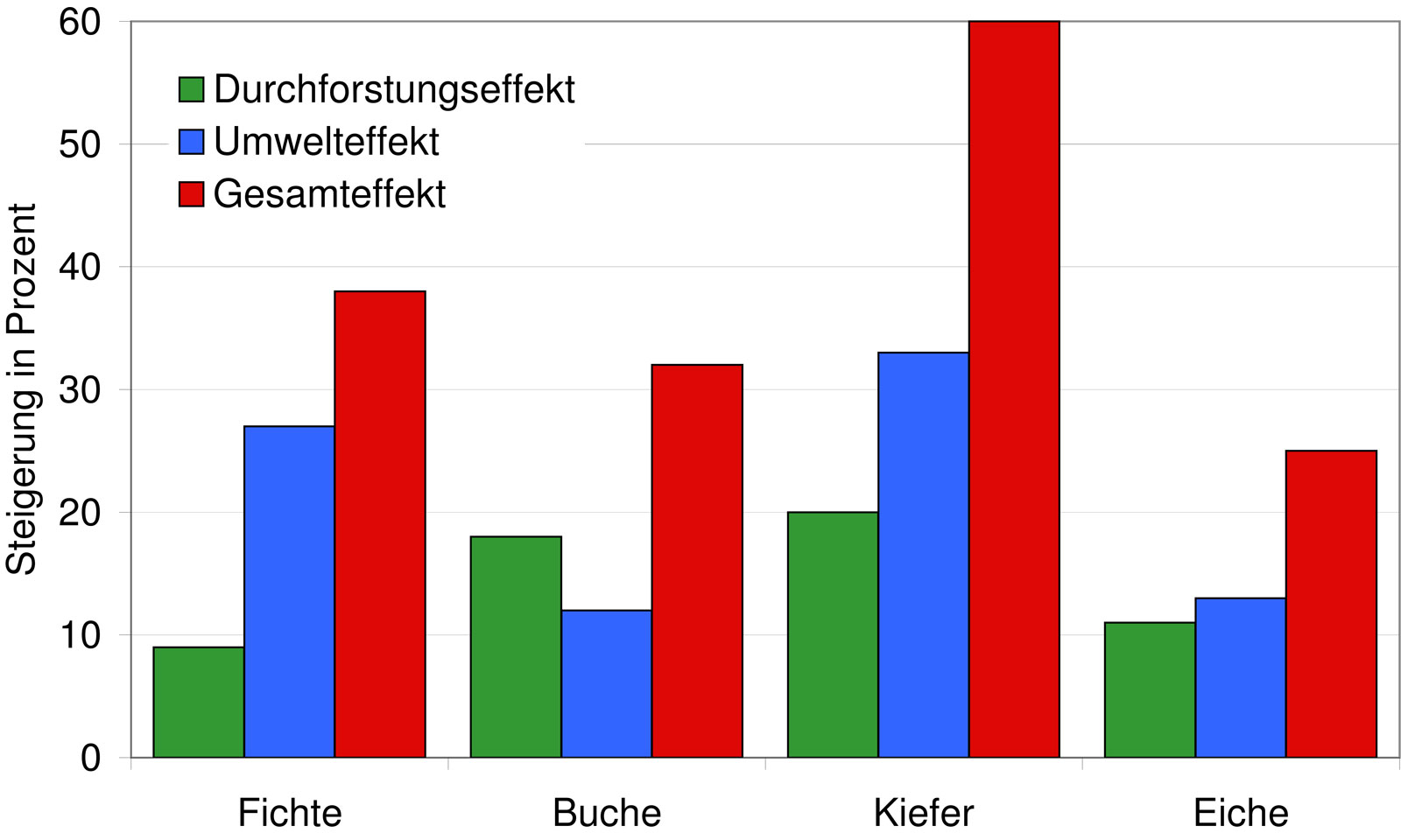 Der Umwelteffekt lässt sich als Veränderung des Volumens des Grundflächenmittelstammes mäßig durchforsteter Bestände im Vergleich zur Ertragstafel im Alter 100 quantifizieren. Er wirkt bei Kiefer und Fichte (+33 % bzw. + 27 %) besonders stark, bei Buche und Eiche mit + 12 bzw. + 13 % deutlich schwächer, die Größenordnung ist jedoch nicht zu vernachlässigen.