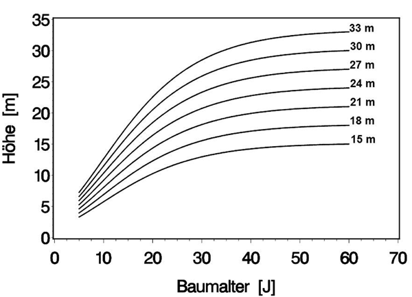 Abb. 5: Bonitätsfächer der Edelkastanie für die Höhenbonitäten 33 m bis 15 m (jeweils im Alter 60 J).