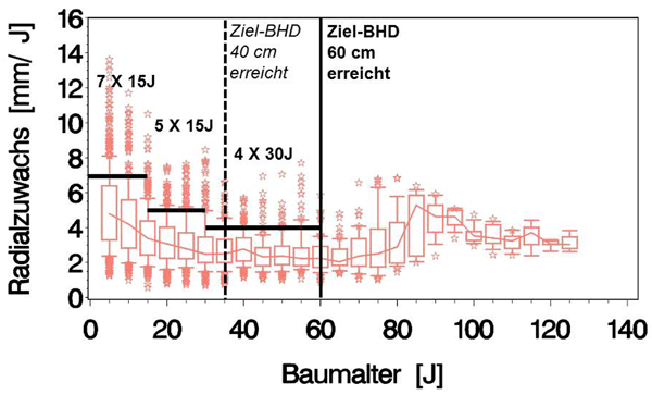 Abb. 6: Verlauf des gemessenen jährlichen Radialzuwachses über dem Baumalter. Die horizontalen Linien zeigen eine gutachtliche Abschätzung des bei starker Z-Baum Freistellung erreichbaren Niveaus jährlicher Radialzuwächse an.
