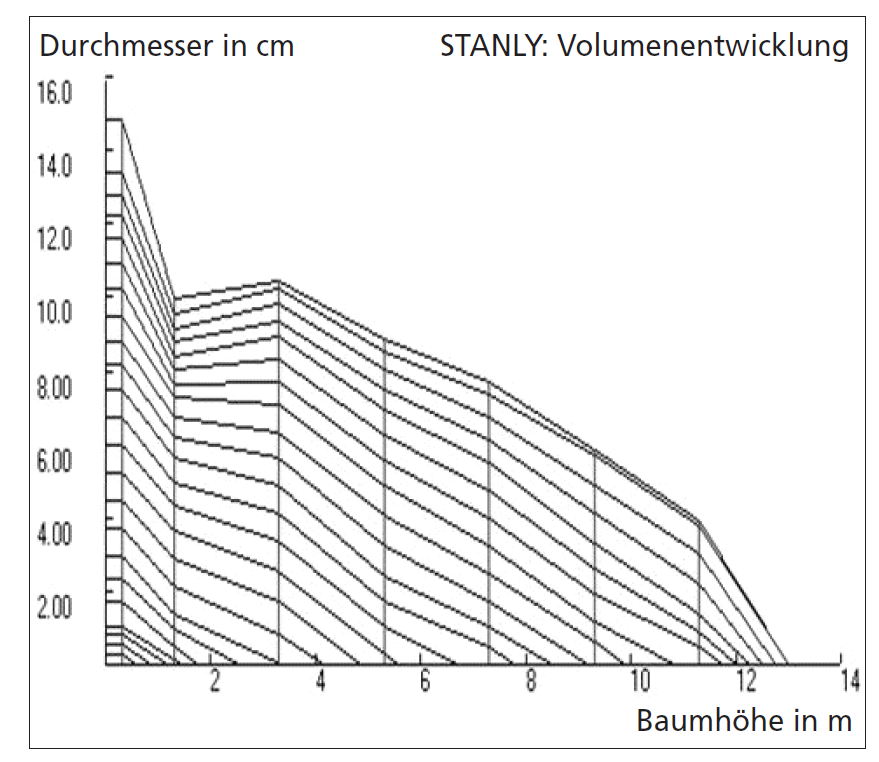 Aus dem Proben- und Datenmaterial für die Jahrringforschung lassen sich die vergangenen Entwicklungsprozesse am Einzelbaum und im Bestand interpretieren (Abb. 3). Die Jahrringforschung kann dem Bewirtschafter dadurch wichtige Informationen zu Höhen-, Durchmesser- und Volumenentwicklung der Bäume, allfällige datierbare Störeinflüsse und Vitalitätseinbrüche im Wachstum und deren mögliche Ursachen liefern. Damit erhält er wichtige Hinweise zur Korrektur seiner Bewirtschaftungsziele und -massnahmen. Auch durch die Bewirtschaftung ausgelöste Folgereaktionen lassen sich untersuchen. Zum Beispiel: