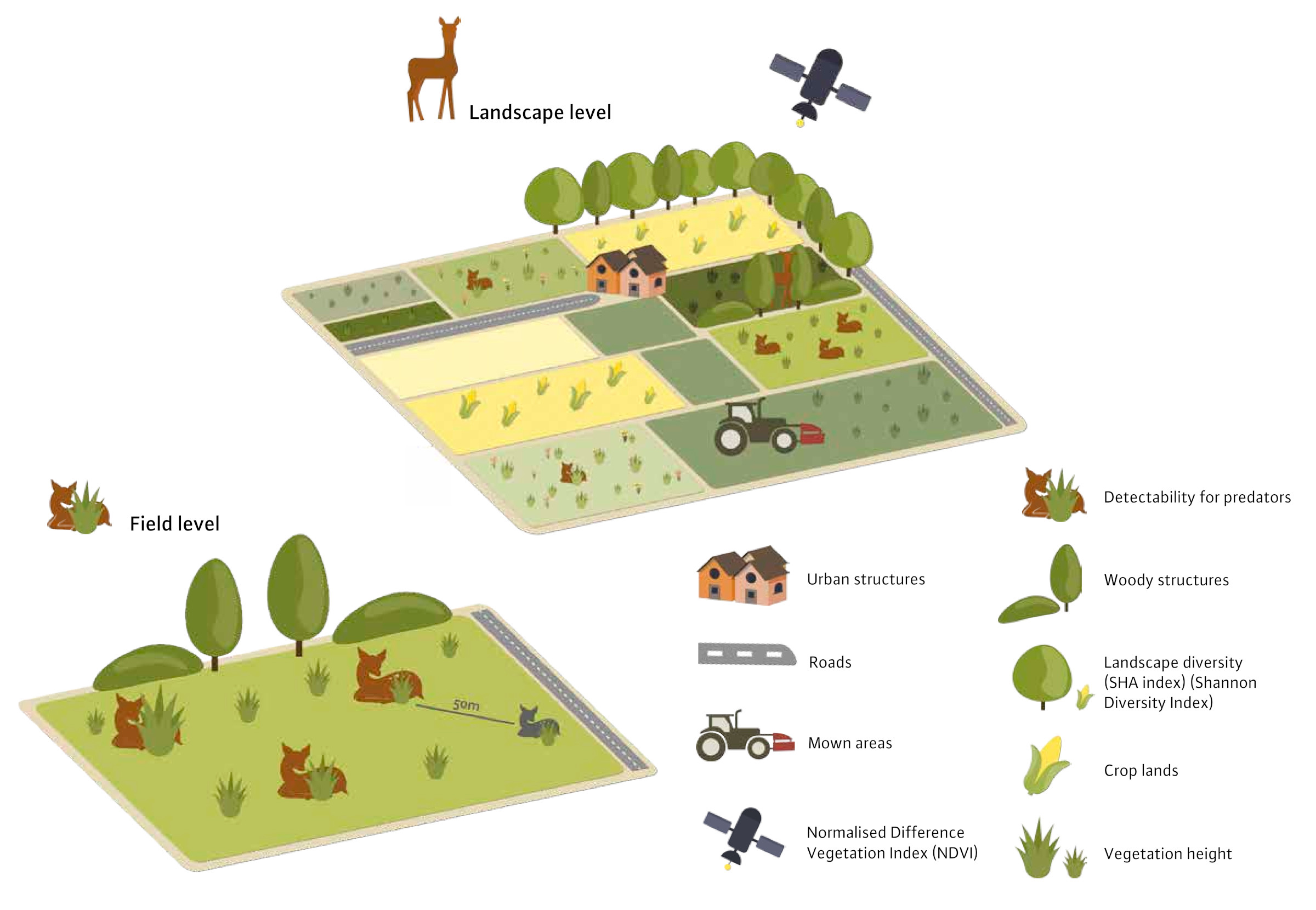 More than 600 fawn bed sites and more than 450 fields where no fawns were found were included in this comprehensive study in Bavaria. We analysed the data collected at two spatial levels. This approach made it possible to estimate the influence of the female on the approximate choice of the site (landscape level) and to investigate the exact choice of bed site by the fawn within this “pre-selection” (field level) (Figure 2). We used geo-information data to characterise the areas within a radius of 100 m around the bed site at the landscape level. Here, factors such as the structural richness of the landscape, the presence of human settlements, distance to roads and forests, the number of mown fields in the surrounding of the bed site at which the fawn was found, and the NDVI (Normalised Difference Vegetation Index, as an indicator of food availability for the doe) were included and compared statistically with the areas where no fawns were found. The statistical approach used (GAMLSS) made it possible not only to compare the fields with and without fawns but also to investigate which factors favoured the number of fawns hidden.