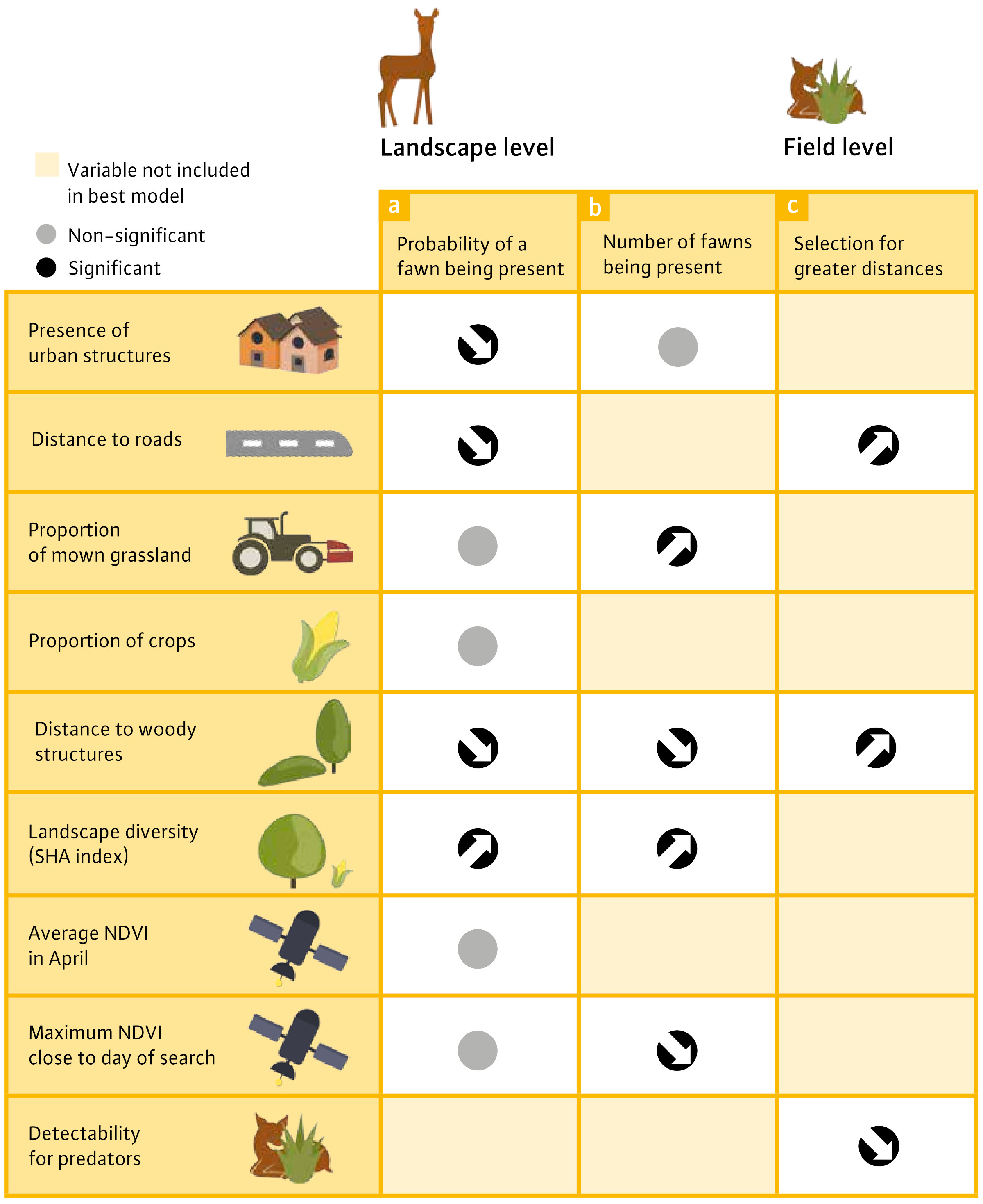 Fig. 3: Results of the bed site analysis for both spatial levels. The statistically significant variables are shown in black. An upward arrow means under a) an increasing probability of finding a fawn correlates with an increase in the given variable; under b) an increasing number of fawns found with an increase in the given variable; and under c) a selection for longer distances with an increase in the variable.