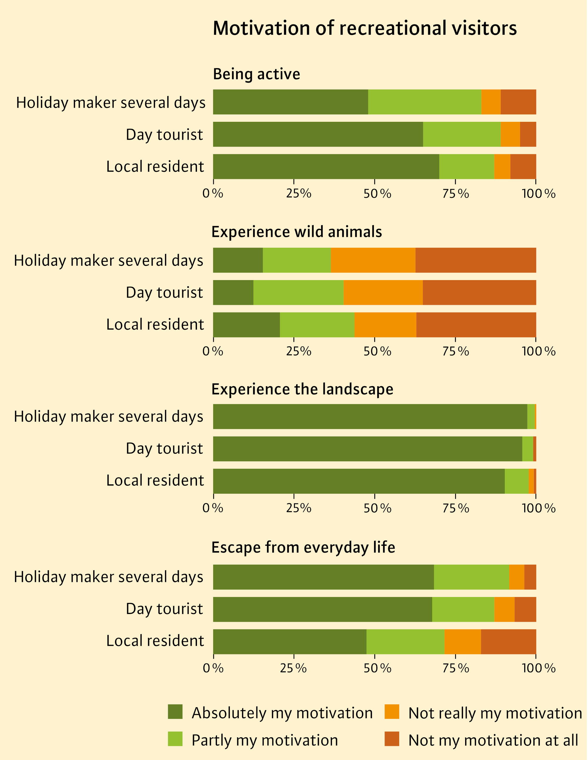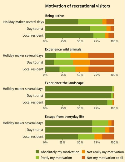 What motives led recreational visitors to the respective regions? With this question there were differences between the areas, particularly with regard to the motivation to do something active or for one's own health and fitness. This aspect was more important in the Chiemgau region, whereas in Karwendel the focus was more on experiencing the landscape and relaxation. In both areas, “being active” was more important to day tourists and residents than to holidaymakers staying for several days. The latter travelled mainly for the scenery and to escape from everyday life (Figure 3). “Experiencing wildlife” played only a subordinate role in visitor motivation in both project areas - regardless of the category of recreational visitor - and it was not a decisive reason for visiting the project area.