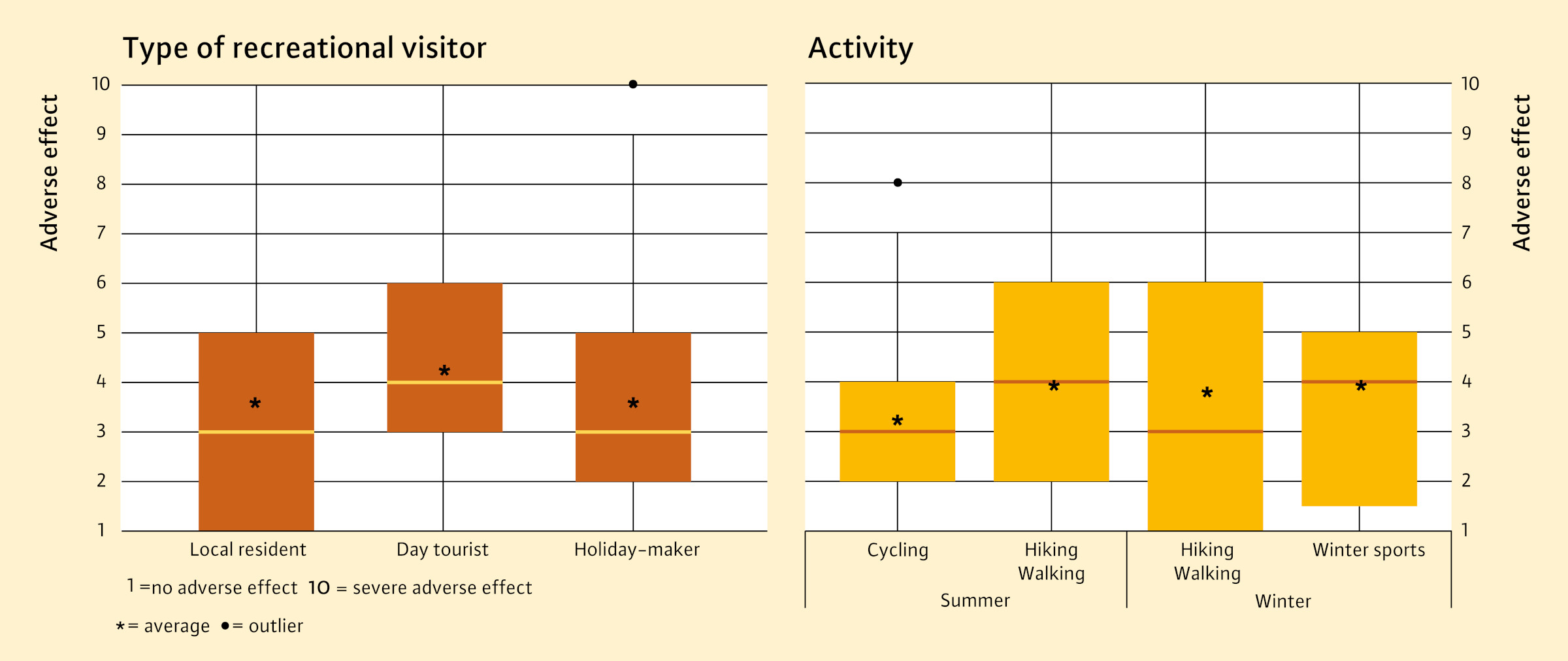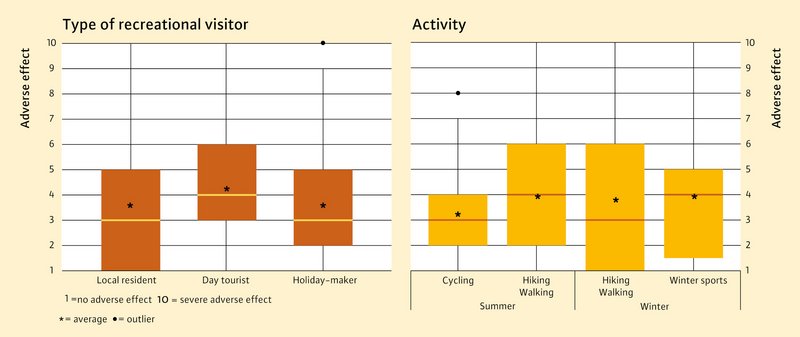Using a ten-point scale, respondents were asked to rate the extent to which their presence in the area affected wildlife (1 = no adverse effect to 10 = severe adverse effect). On average, respondents rated their own adverse effect on wildlife higher in the Chiemgau area (4.5) than in the Karwendel area (3.6), with day tourists rating it higher (4.4) than residents and holidaymakers (3.8) (Figure 4). Cyclists rated their impact on wildlife at an average of 3.4, while hikers and walkers (winter and summer) and winter sports enthusiasts (tobogganists, ski tour enthusiasts, skiers, snow-shoe hikers) rated theirs at 4.0.