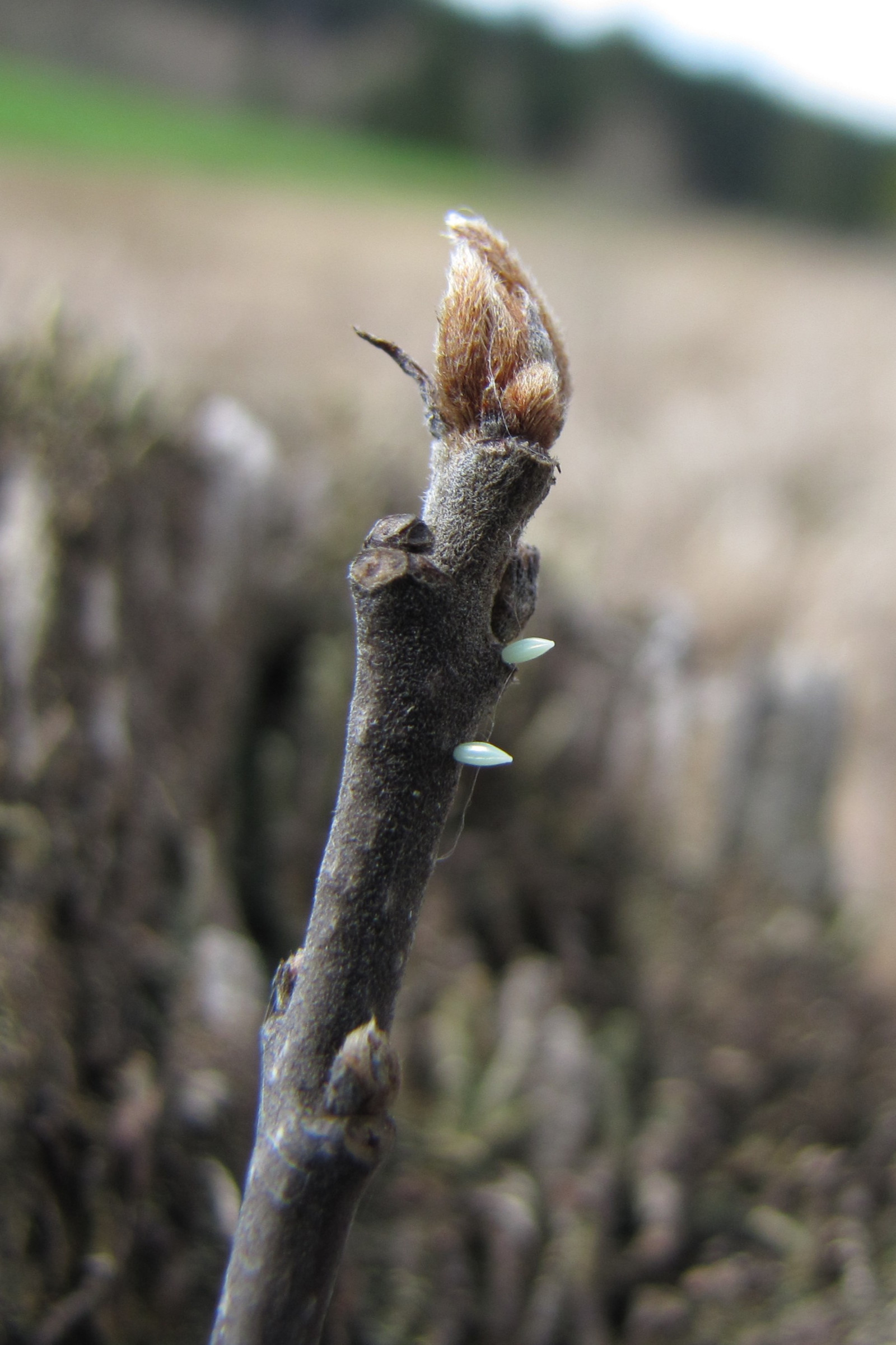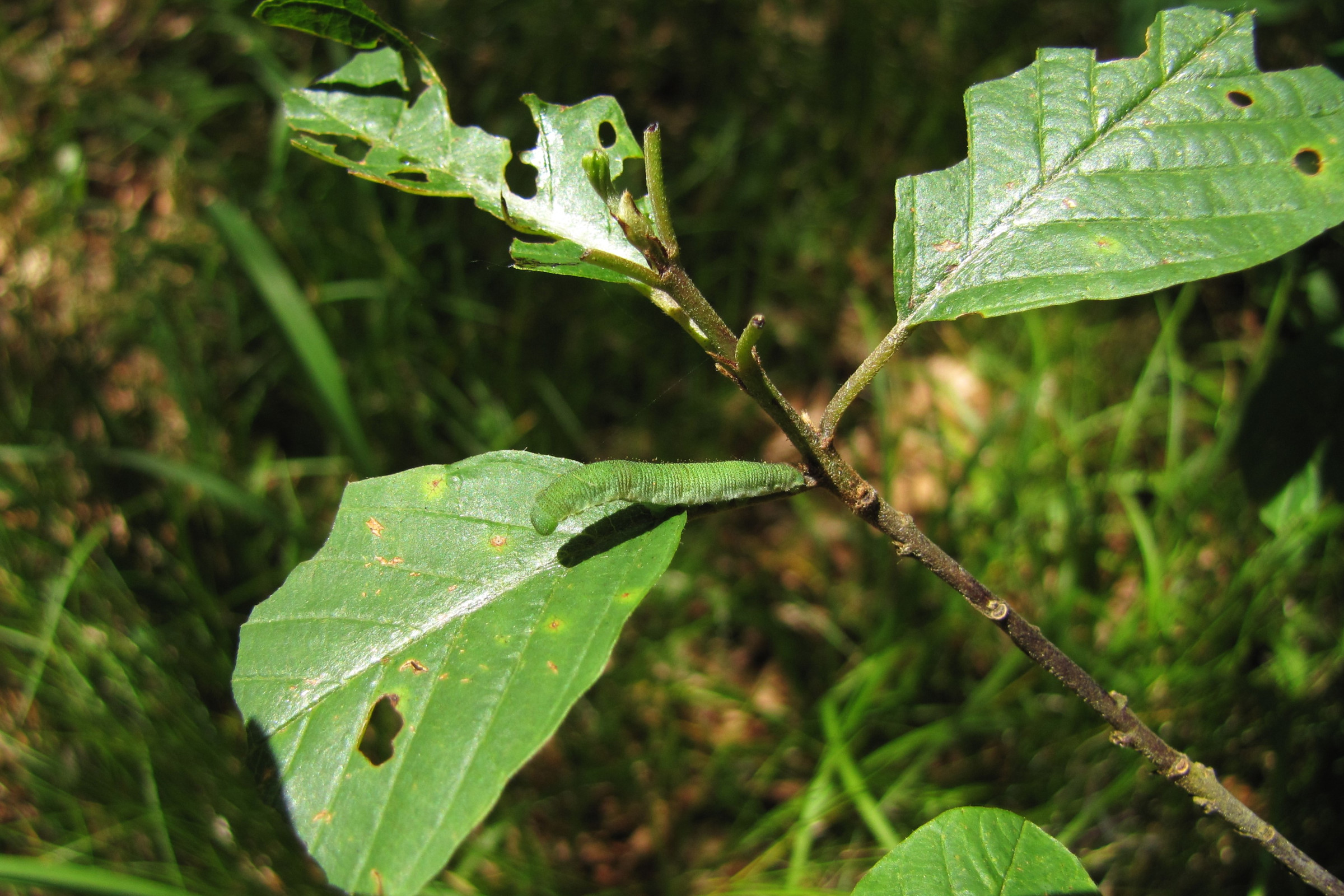 After mating, the female brimstones begin in April to May to lay their eggs individually on the buds of alder buckthorn (Frangula alnus) or common buckthorn (Rhamnus carthatica) (Fig. 2). The brimstone butterfly is closely tied to these shrub species of the genus Rhamnus, as the caterpillars can only develop on these. The caterpillars hatching from the eggs are green in colour, and well camouflaged on the leaves of the buckthorn (Fig. 3). After feeding, the caterpillars usually rest along the midrib on the upper side of the leaf. The close relationship between the brimstone and these rather overlooked shrub species shows the ecological importance that even inconspicuous plants can have for the biodiversity of our forests – without the alder buckthorn, there would be no common brimstone!