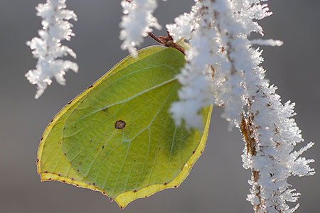 In September, the butterflies reappear to recharge their batteries for the long hibernation period on late-flowering herbs such as thistles. They then hibernate in the open, e.g. among dry leaves, in crevices in walls, or among old ivy vines. Their body fluid contains glycerine and certain proteins that serve as “antifreeze”, increasing the concentration of the cell fluid. This allows the brimstone to withstand temperatures as low as -20° Celsius without damage.
