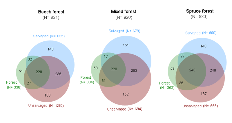 | Dead wood, ø>1cm, (m3/ha) | Forest: 36.7 Unsalvaged: 324.6 Salvaged: 148.9 | Forest: 36.5 Unsalvaged: 274.8 Salvaged: 49.5 | Forest: 22.7 Unsalvaged: 643.4 Salvaged: 79.0 |