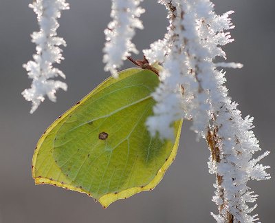 Stiff as a board as if it was frozen, exposed on twigs, shrubs or hanging on tree bark; this is how the tender butterfly defies the winter. Thanks to stored glycerin in its bodily fluids the brimstone butterfly doesn't freeze. Additionally, at the beginning of winter it will discharge a part of its bodily fluids and eliminates practically all the water that it doesn't need. In this way the brimstone butterfly can survive temperatures well below -10° C.