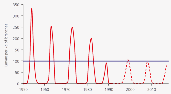 Fig. 3. Cyclical population fluctuations of the larch moth in the Upper Engadine. The mean periodicity is 8.5 years and the threshold for visible discoloration of larch stands is 100 larvae per kilogram of branches (blue line). The solid red curve is based on data from Baltensweiler (1993a) and Baltensweiler and Rubli (1999). The dashed line is based on visual estimates made in the field.