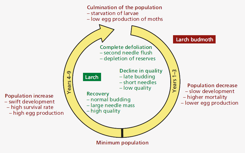 As with all leaf-feeding caterpillars that overwinter at the egg stage, the timing or degree of synchrony between needle budding and the emergence of the young larch budmoth larvae is crucial. In the years after a mass outbreak, the synchrony of these events worsens and larvae emerging at the usual temperature-triggered time miss fresh, tender, readily digestible larch needles. As a result, at least the earliest larch budmoth larvae of the new population end up starving. Those larvae that do survive find needles of inferior quality that are difficult to digest and have a lower nutritional value. As a result, they grow more slowly, gain less weight and have a higher mortality rate. Moreover, the moths that develop from these larvae produce up to 90% fewer eggs. This delayed negative feedback triggers a drastic decline in the moth population density.