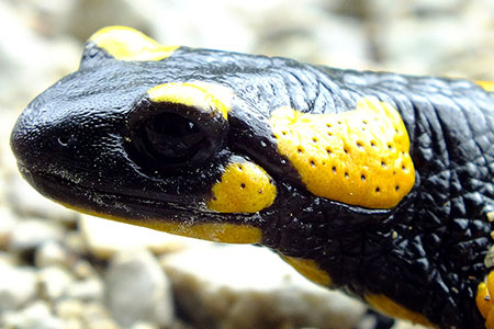 A fire salamander is an impressive sight. With its shiny black and yellow-spotted skin and length of up to 20 cm, this amphibian is so conspicuous that even amateurs can recognise it immediately.