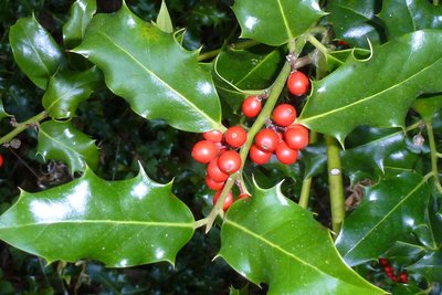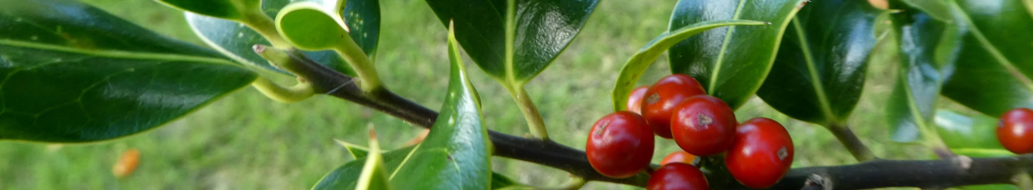 The holly has various shapes of leaf, presumably to protect it from browsing. In the lower limbs of the shrub, the leaves are wavy and very prickly. Further up the tree, out of the reach of hoofed game browsers, there are fewer and fewer spines on the leaves, until they are eventually completely flat and lacking in spines. Different leaf shapes on the same specimen is a phenomenon known in botany as “heterophylly”.