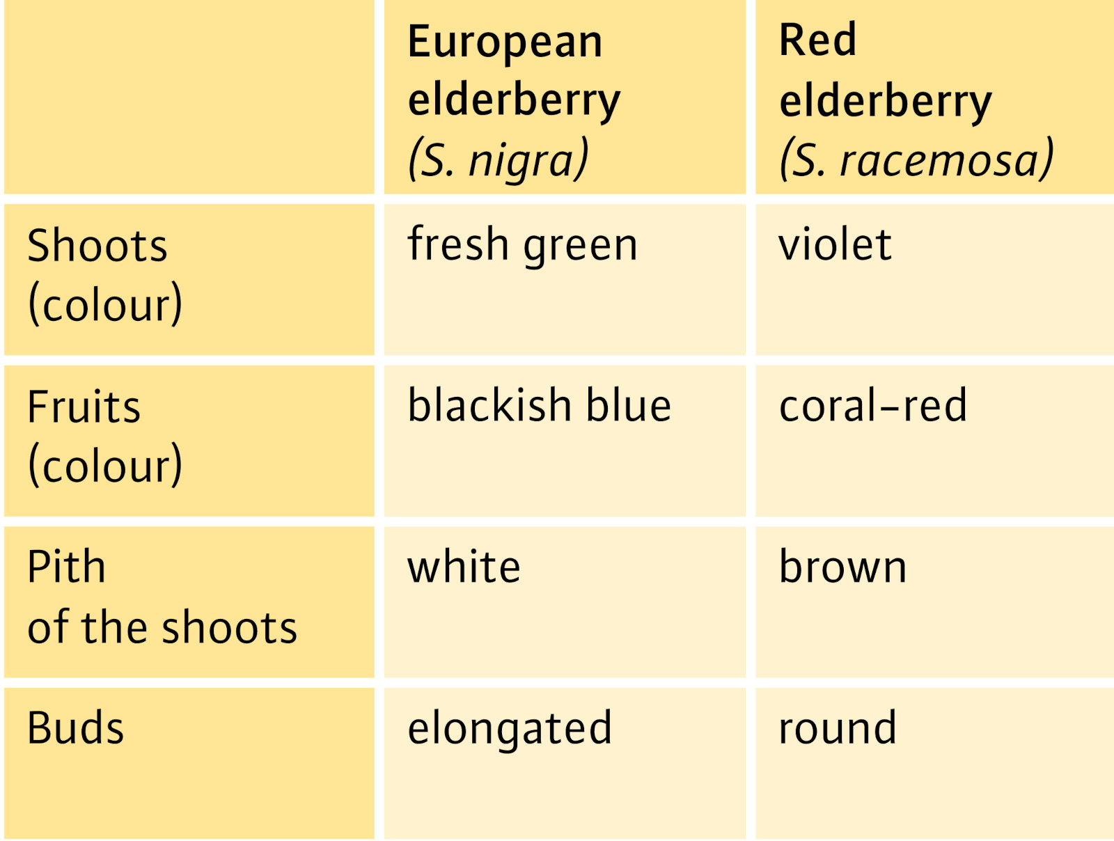 The red elderberry only reaches a size of 2-4 (5) metres and thus remains significantly smaller than the black elderberry. Although fast-growing, it is also a relatively short-lived woody plant. As with all members of the honeysuckle family (Caprifoliaceae), the 10-20 cm long leaves of the red elderberry are opposite. They are unevenly pinnate and usually consist of 5 serrated leaflets measuring 5-8 cm altogether. The round, egg-shaped buds are well wrapped in several bud scales. In contrast to this, bud leaves often show through the bud scales of the elongated buds of the black elderberry. The shoots appear in April and, in contrast to the green shoots of the black elderberry, are reddish to purple in colour.