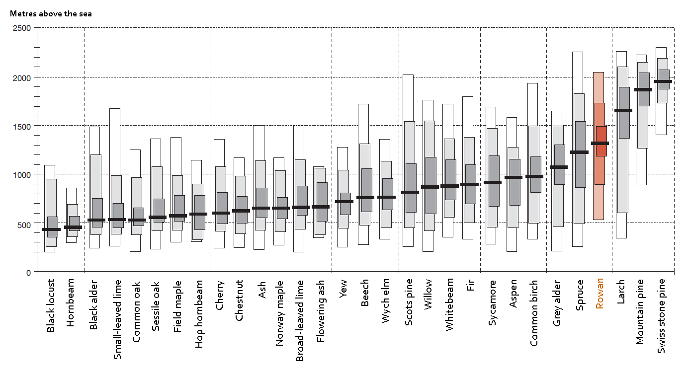 90% of rowan trees grow in the upper montane and lower subalpine zones, with half of these lying more than 1,300 metres above the sea (Figure 4). The NFI rowan sample plot at the highest altitude is currently located 2,167 metres above the sea at Saas-Balen, Valais. When combined with the alpine alder (green alder), the rowan can be found at altitudes of up to 2,300 metres. It is the deciduous tree with the greatest altitudinal distribution, just ahead of the birch and grey alder (Figure 4). The occurrence of this photophilous pioneer species is largely conditioned by competition. It is more common than average in sparsely populated mountain forests, in selection-type, non-uniform high forests, in young growth, and in uniform high forests with clearings.