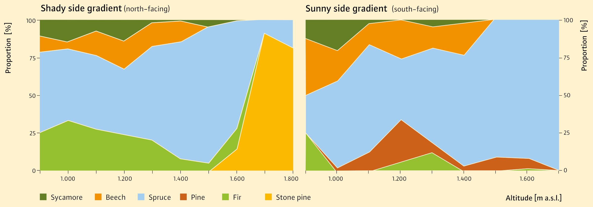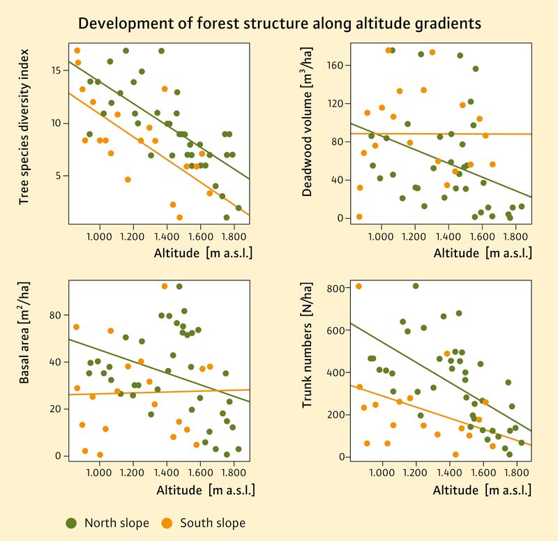 Differences, however, were observed in the amount of deadwood and the basal area of the living stand. While neither parameter shows any change over altitude on the south-facing slopes, there was a decrease in both cases with increasing altitude on the shaded slopes. It should be noted that the values between 800 and 1,600 m above sea level are relatively evenly distributed, and only decrease significantly above 1,600 m above sea level. The decline in the amount of deadwood and stand basal area on the shaded slopes is mainly due to the occurrence of high subalpine larch and Swiss stone pine forests there, which, from 1,600 m above sea level, take over from the high altitude spruce forests that are richer in deadwood and have a higher basal area.