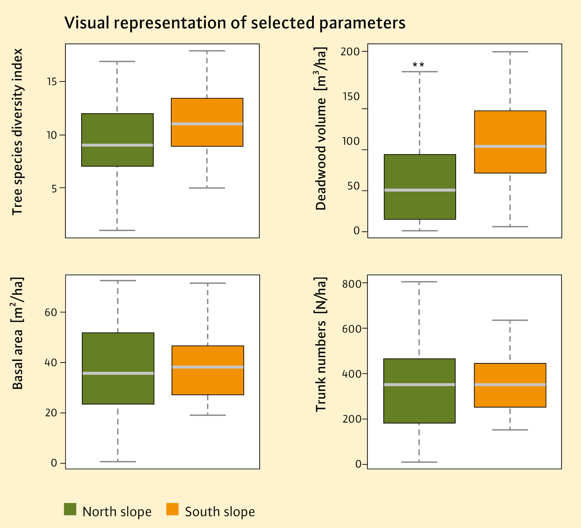 The fact that there are differences in the forest structure between the north- and south-facing slopes can be seen in the tree species composition of the experimental plots (see above). The warmth-favoured sunny slopes are characterised by the occurrence of Scots pine, especially in the middle altitudes, while the occurrence of Swiss stone pine-dominated stands is characteristic of the high altitudes of the shady slopes. On the other hand, the supply of standing and lying deadwood differed significantly between the two gradients, with the drier and warmer southern slopes having considerably higher amounts of deadwood on average (Figure 5). One reason for this is assumed to be a higher rate of tree mortality (e.g. due to bark beetle infestation) on these sites, which are prone to phases of drought. On the other hand, there are hardly any differences in tree species diversity, the basal area of the living stand and the number of stems between the sunny and shady slopes.