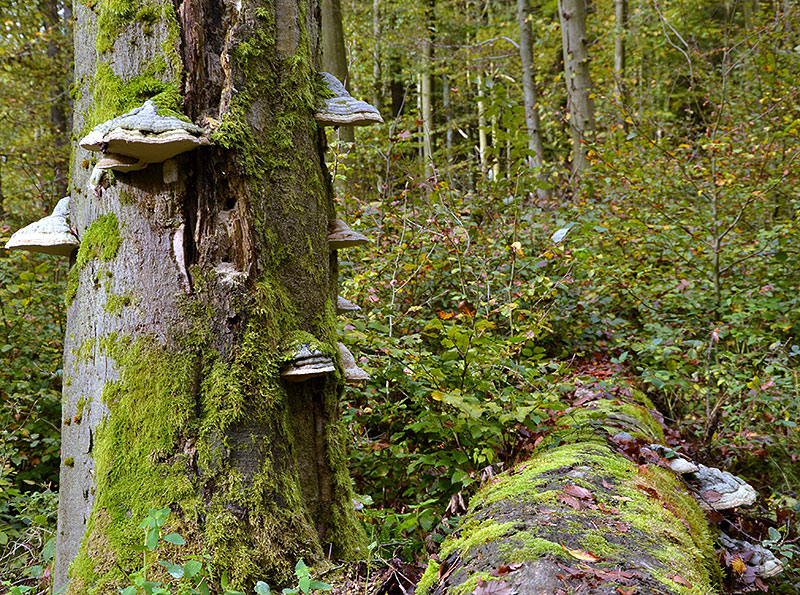 Fig. 3: Nature conservation in forests is inconceivable with out dead wood. It is a habitat for numerous animal and fungal species. Breaks in the canopy that arise due to tree mortality enable light to reach the ground and cause warmth, both of which are important factors for the regeneration of the forest (Picture: J. Böhm).