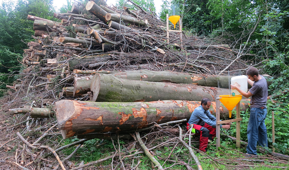 Forest energy wood is generally harvested and processed during the autumn and winter. During the summer, energy-wood piles (Fig. 1) remain in the forest to dry. They therefore attract saproxylic beetles (Fig. 2) as they provide an ideal habitat for these beetles to lay their eggs. However, the larvae of most species do not have time to fully develop before the wood is chopped up, and this could lead to significant declines in populations and even a species dying out completely in particular areas. The Swiss Federal Institute for Forest, Snow and Landscape Research (WSL) is studying the effect of this kind of ecological trapon saproxylic beetle fauna (Fig. 3).