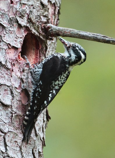 Then there are also the black woodpecker, the European green woodpecker and the grey-headed woodpecker. These three species feed on ants and look for their food not just on tree trunks, but mainly in ant heaps on the ground. The Eurasian three-toed woodpecker is a coniferous forest specialist in mountainous regions. The Eurasian wryneck (Jynx troquilla) – the only migratory bird among these nine woodpeckers – is a species of semi-open landscapes, and occurs in meadow orchards or pasture landscapes.
