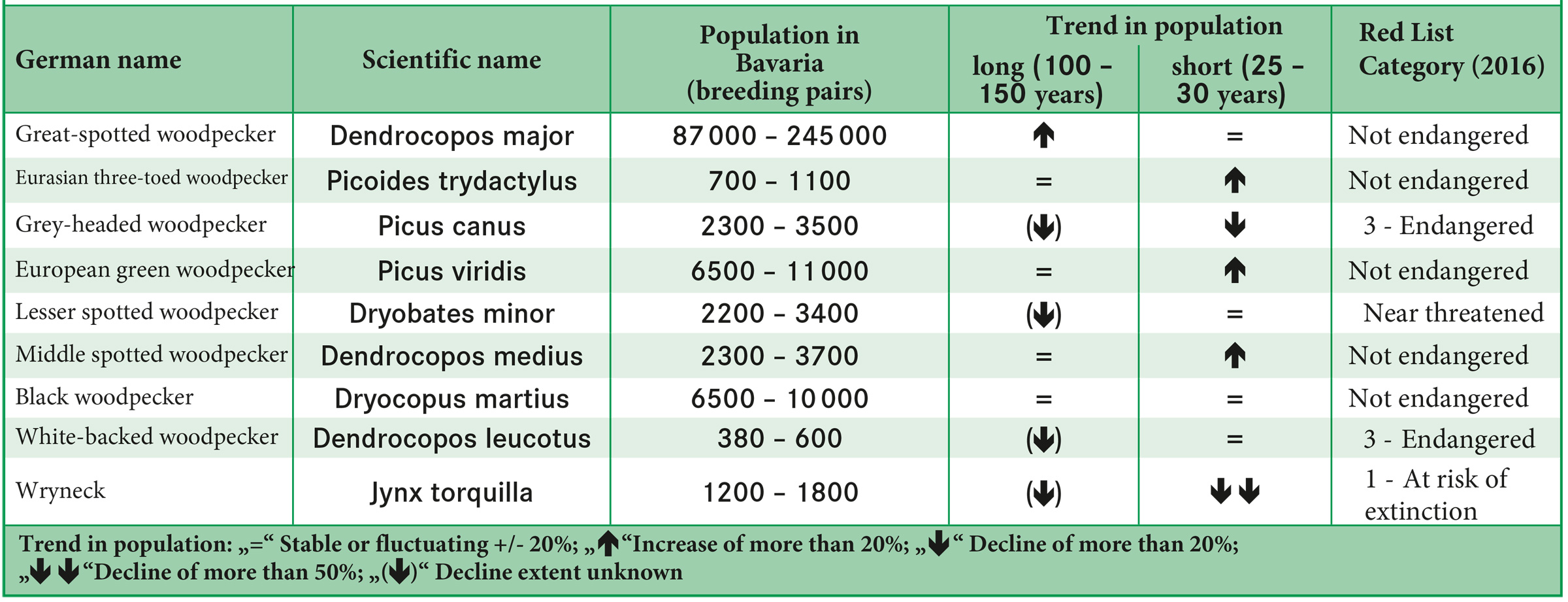 Over the last 25 to 30 years, consistent or positive trends in the population development of all of the species have been observed - except for the grey-headed woodpecker and wryneck (see table). Here is a summary of the most important developments: